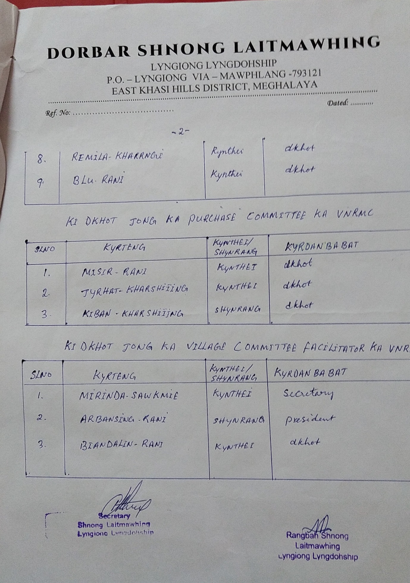 | 1 | Arbansing Rani | Male | 31 | IV | President | Labourer | Khasi | 9612111657 |