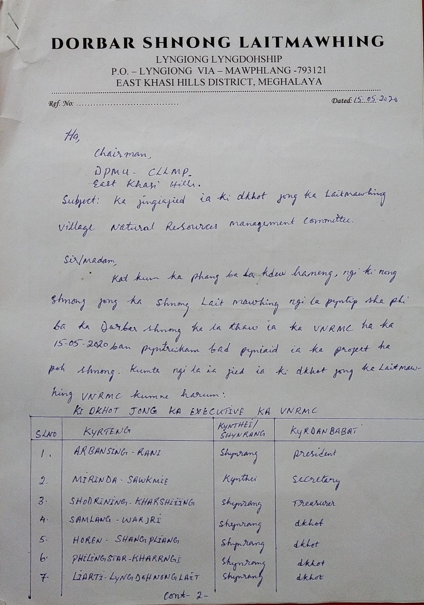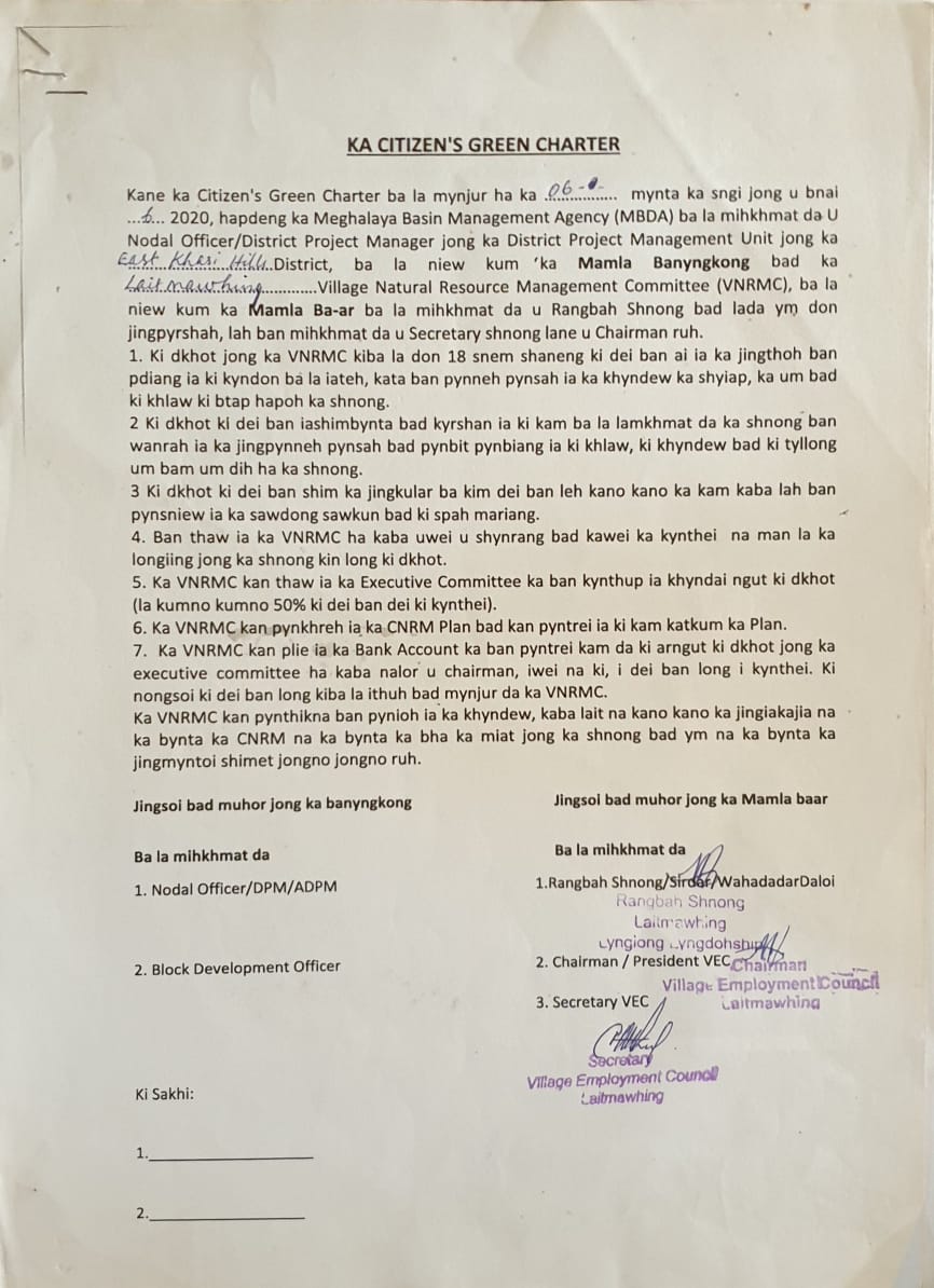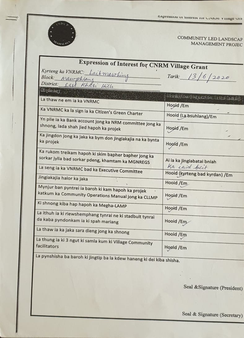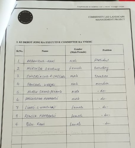 The executive committee of the Dorbar Shnong of Laitmawhing after a meeting formed the members of VNRMC on the 15th of May, 2020. On the 16th of March, the DPMU members visited the village again for the signing of the EOI, VGA and Citizen’s Green Charter and the executive members of the VNRMC were formally introduced.