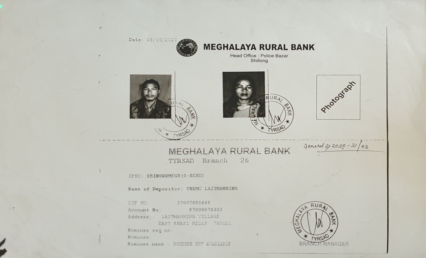 The opening of bank account was initiated after the village signed the EOI (Expression of Interest), VGA (Village Grant Agreement) and the Citizen’s Green Charter. Laitmawhing opened their bank account on the 8th June, 2020.