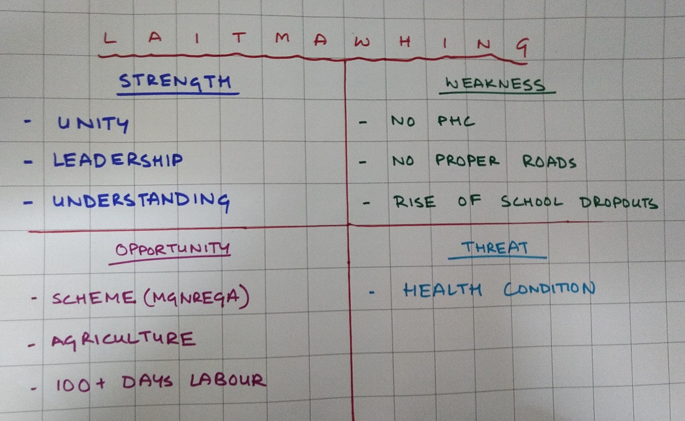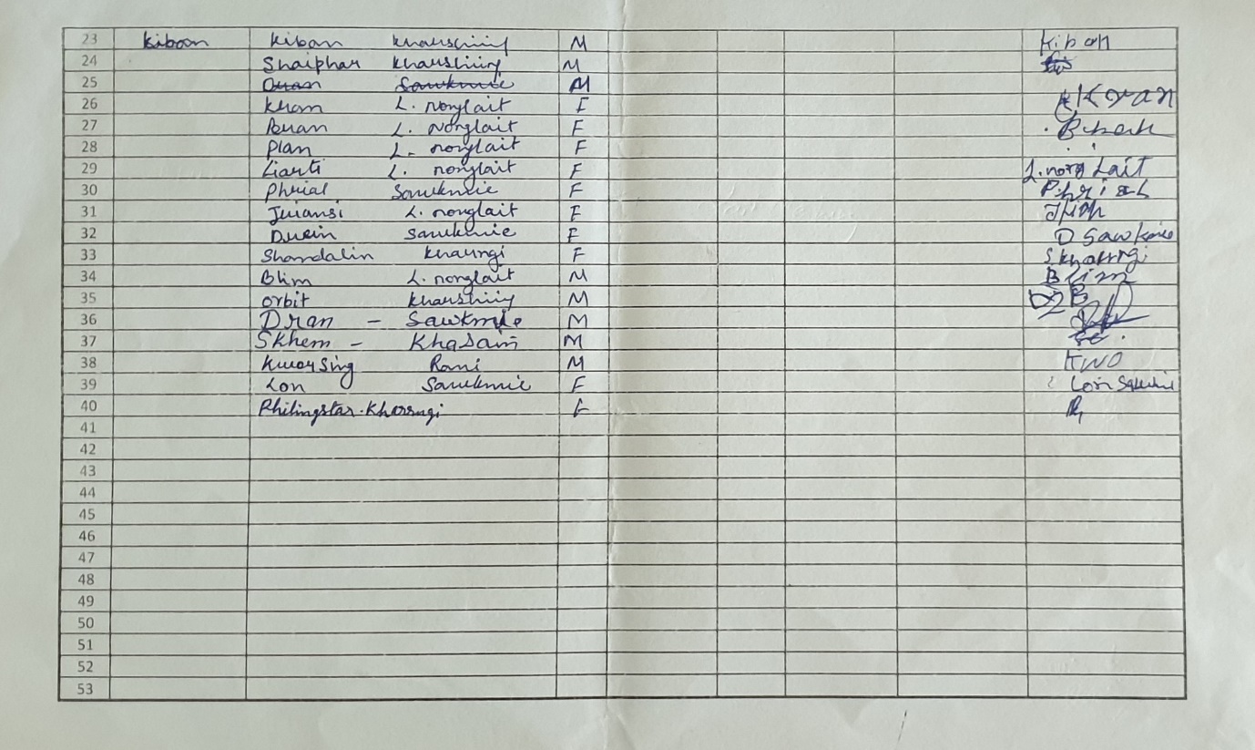 The first contact with Laitmawhing was established in 15th May, 2020 while doing the sensitization and ground truthing programme in the presence of the Headman and executive members of the village along with the people of the village. Some of the findings after the discussion with the Headman were: