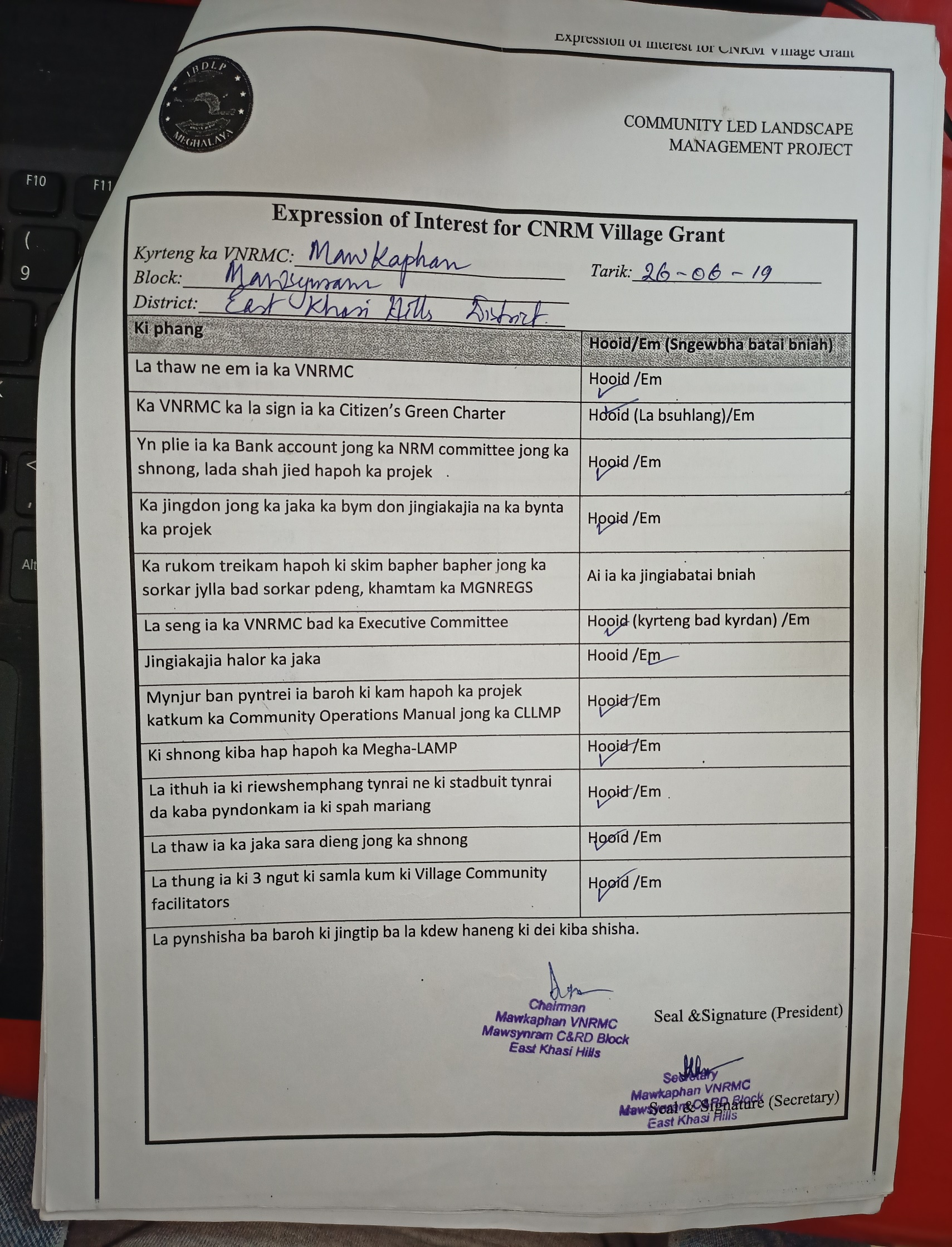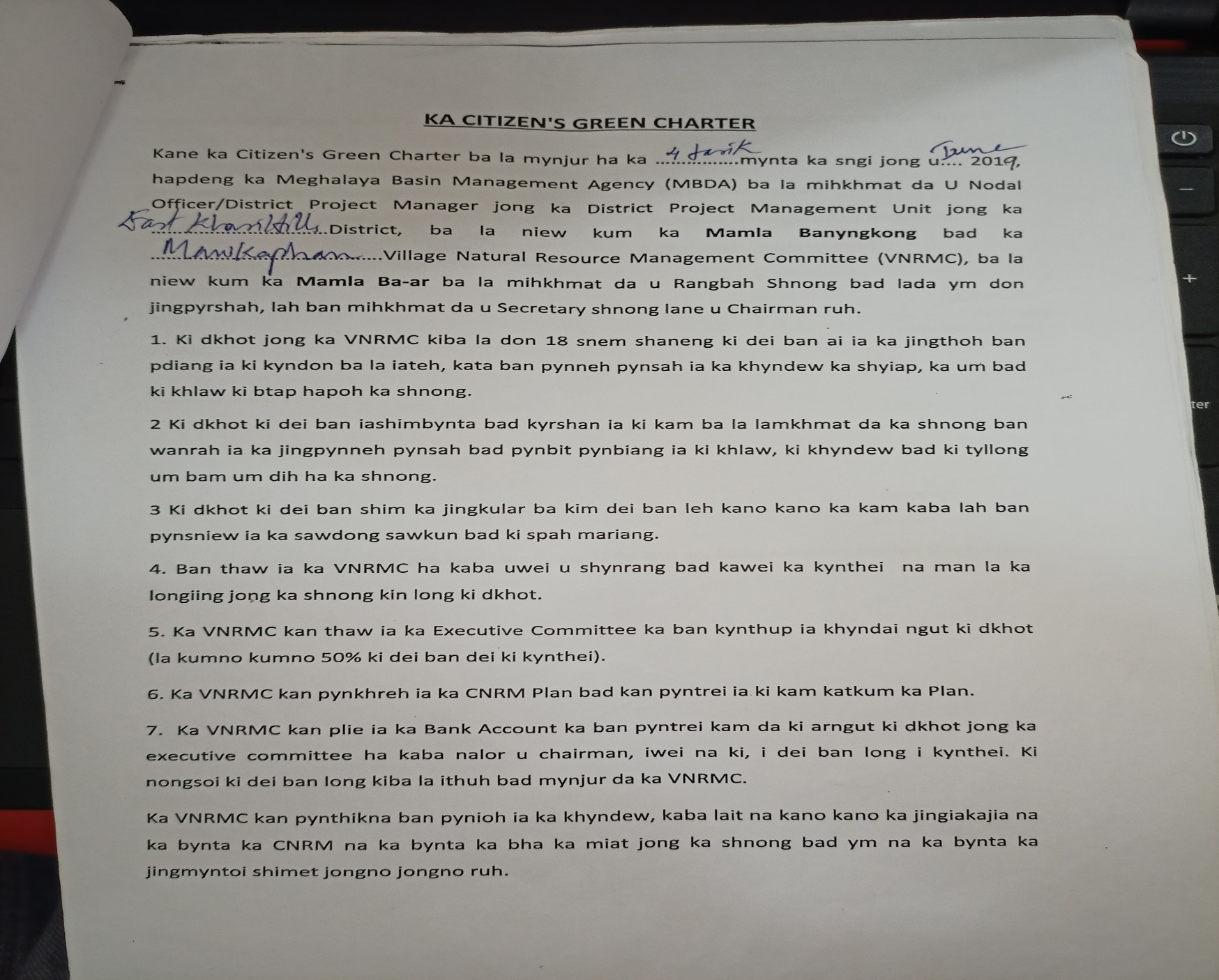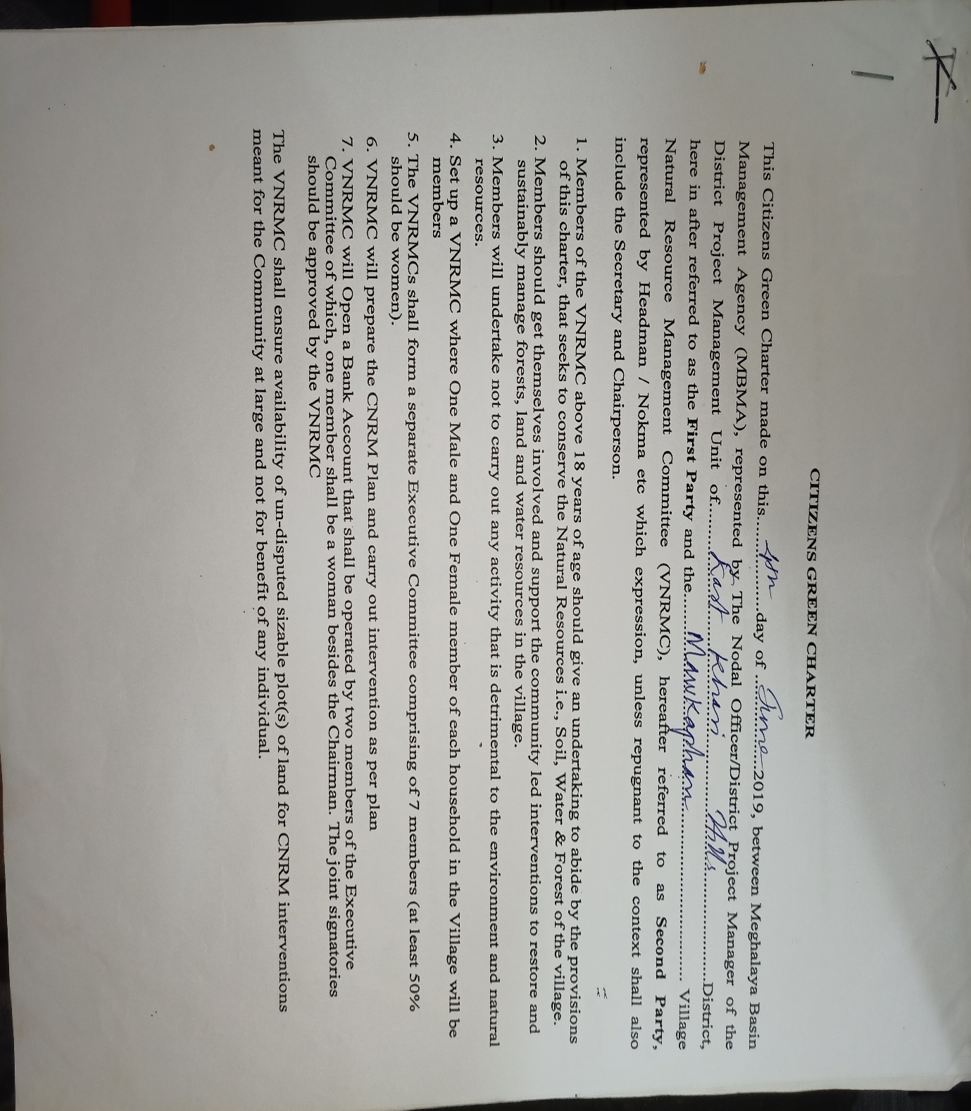 The first contact with Mawkaphan village was established with the headman of the village Bah Gibonsing Kynter on the 10th June 2019. Ground truthing was also done on the same day. Some of the findings after discussion with the headman and ground truthing were: