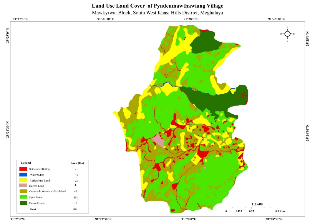 The total forest cover under Pyndenmawthawiang village is 158ha. Most of the forest cover are on private land and the quality of the forest is moderate. People uses the forest products mainly for fuelwood, timber as medicines, aromatic plants and for other purposes. Some of the forest that falls on the private land within the village are Wahlarew, Laitkynja, Lawriat, Sohphoh, Synrang Thapbulong.